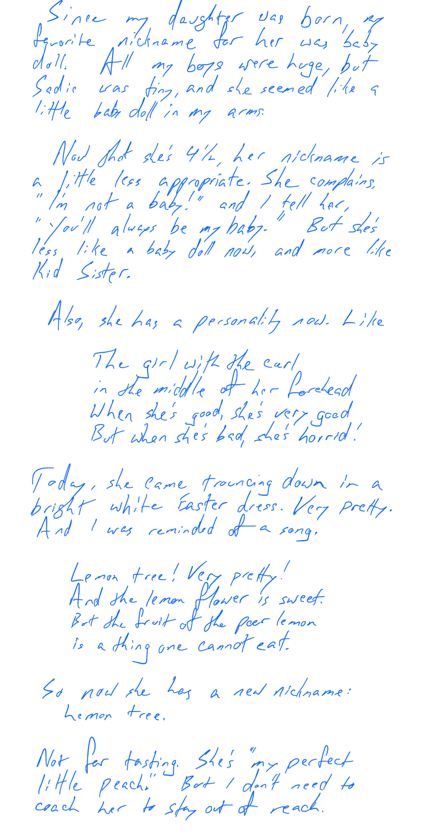 Now that she’s 4 ½, her nickname is a little less appropriate. She complains, “I’m not a baby!” And I tell her, “You’ll always be my baby.” But she’s less like a Kewpie now, and more like Kid Sister.